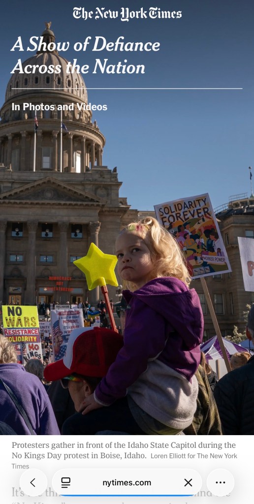 1:30 p.m.: Read a New York Times article about the “No Kings” protests happening across the country. This was straightforward news reporting from a well established outlet, covering the wave of demonstrations pushing back against what organizers are calling an overreach of executive power.